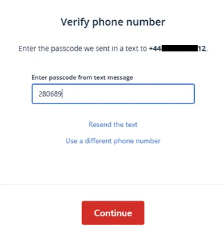A code will be sent to the number supplied, copy this code onto the next screen then click "Continue";