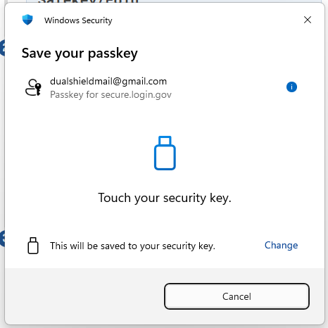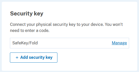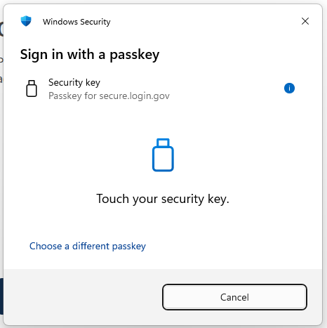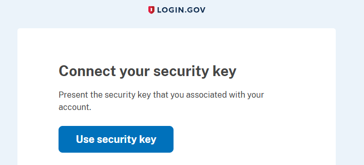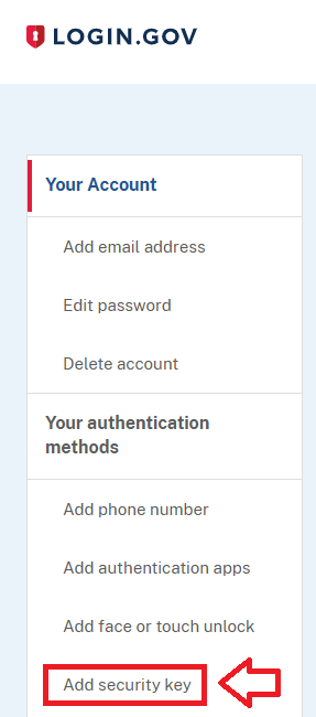Sign in to the your Login.Gov account, then in the "Your Account" column, select the option "Add security key" (if your account has only just been created, then you will be presented with a list of options, select the option "Security key");