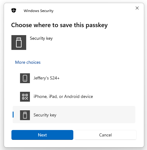 In order to specify we are adding a Fido key we need to select the option "Use a security key device";