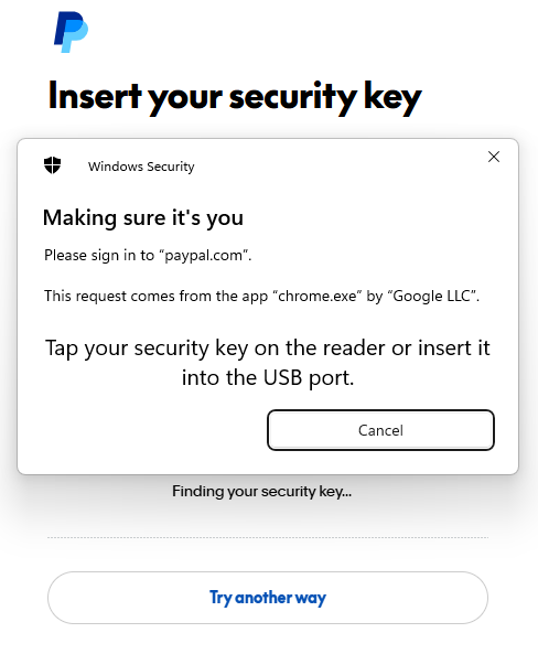 You should now insert your Fido key into an available USB Port and select the option "Security key";
