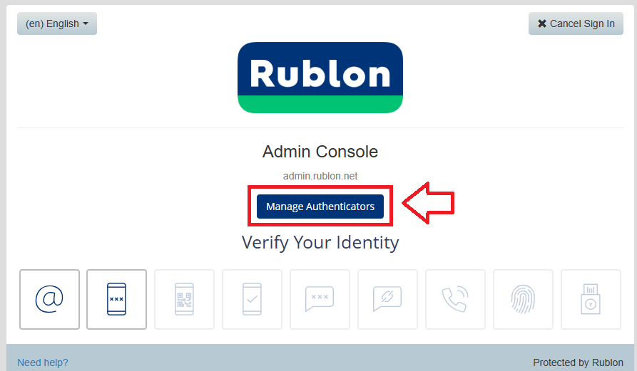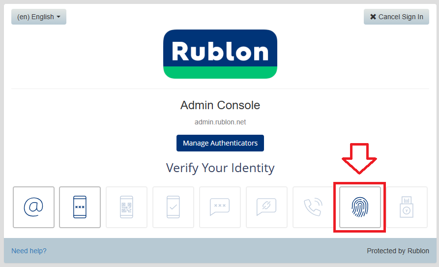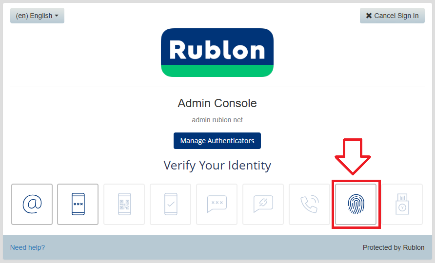 - Log in to your Rublon account, then you will be presented with the list of available authentication methods (which now include the fidokey option;