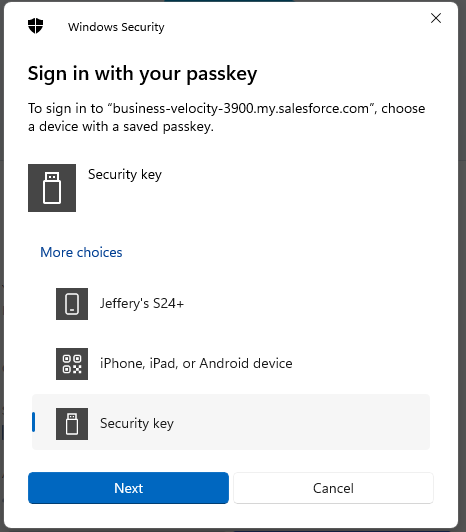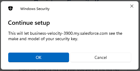 You are now ready to register a Fido2 key with Salesforce, and will presented with the following screen, click