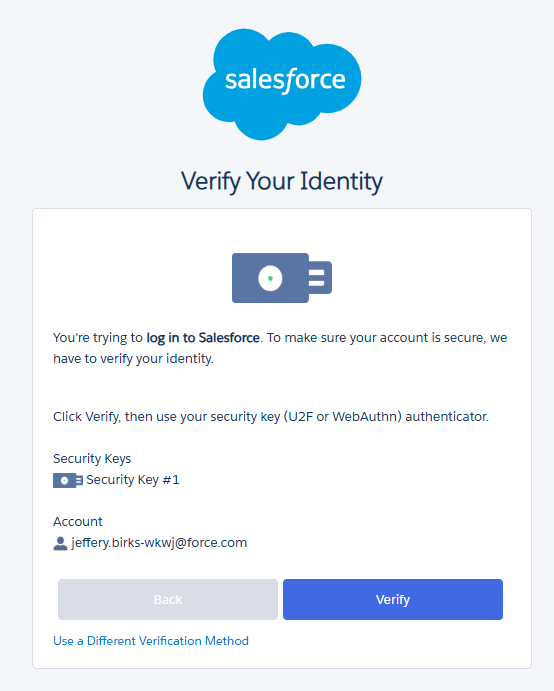 Once you have registered you FIDO2 key with Salesforce the key will be ready to be used as an authentication method when accessing your account;
