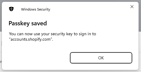 Click "OK", and the FIIDO2 key will be registered with Shopify as soon as you verify the key, and a confirmation will show that the passkey has been created;