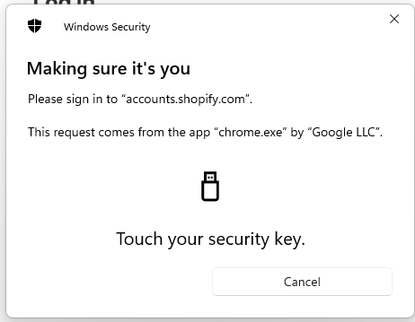 You are now ready to register a Fido2 key with Shopify, and will presented with the following screen, click