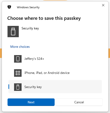 When asked where to save this passkey, select the option "Security Key", then click ;