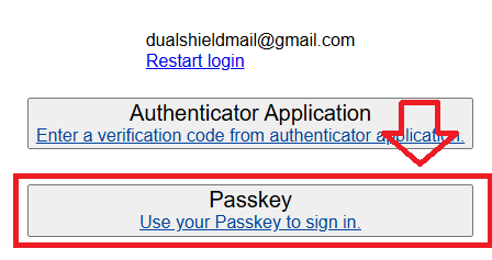 You are then presented with all available authentication options, select "Passkey";