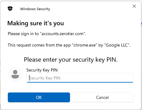 Signing in to a ZeroTier portals with your FIDO2 key