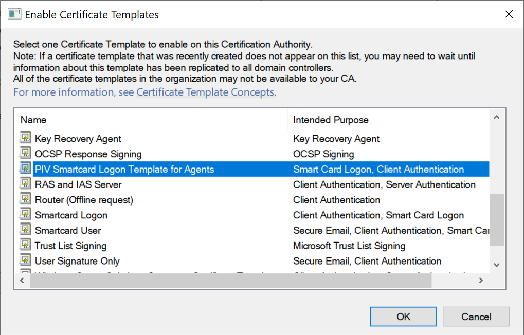 Find and select the newly created enrolment template, e.g. "PIV Smartcard Enrolment Template for Agent". and then click OK