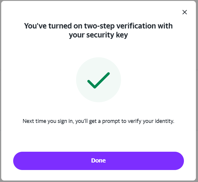 The FIIDO2 key will be registered with eBay, and you will be shown confirmation that the passkey has been added as a two=step verification method;