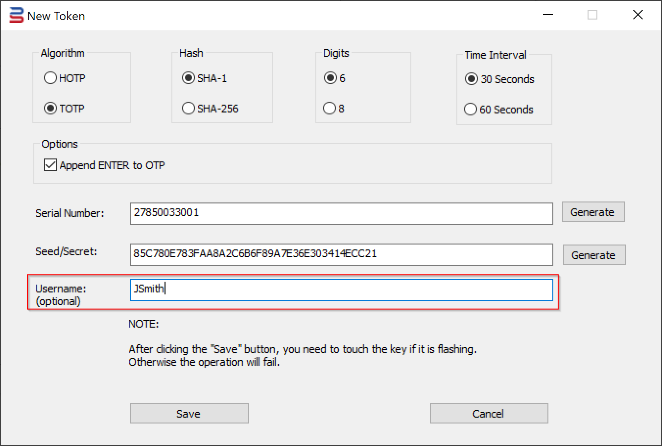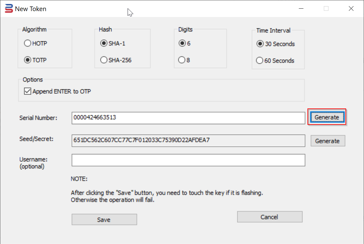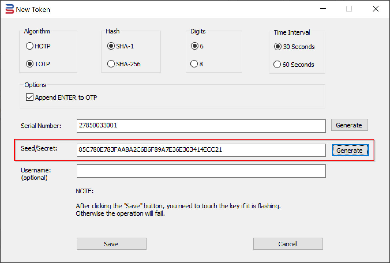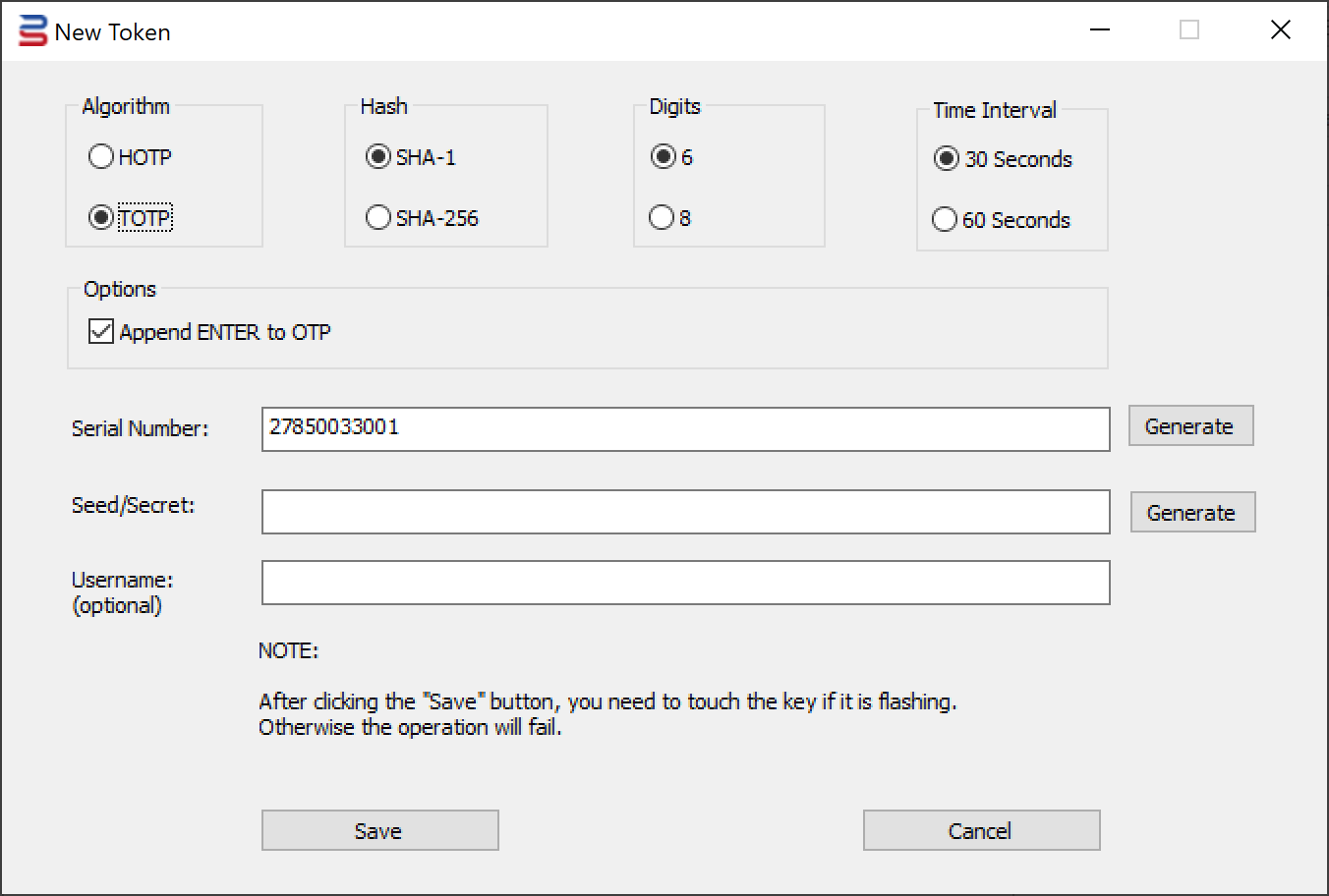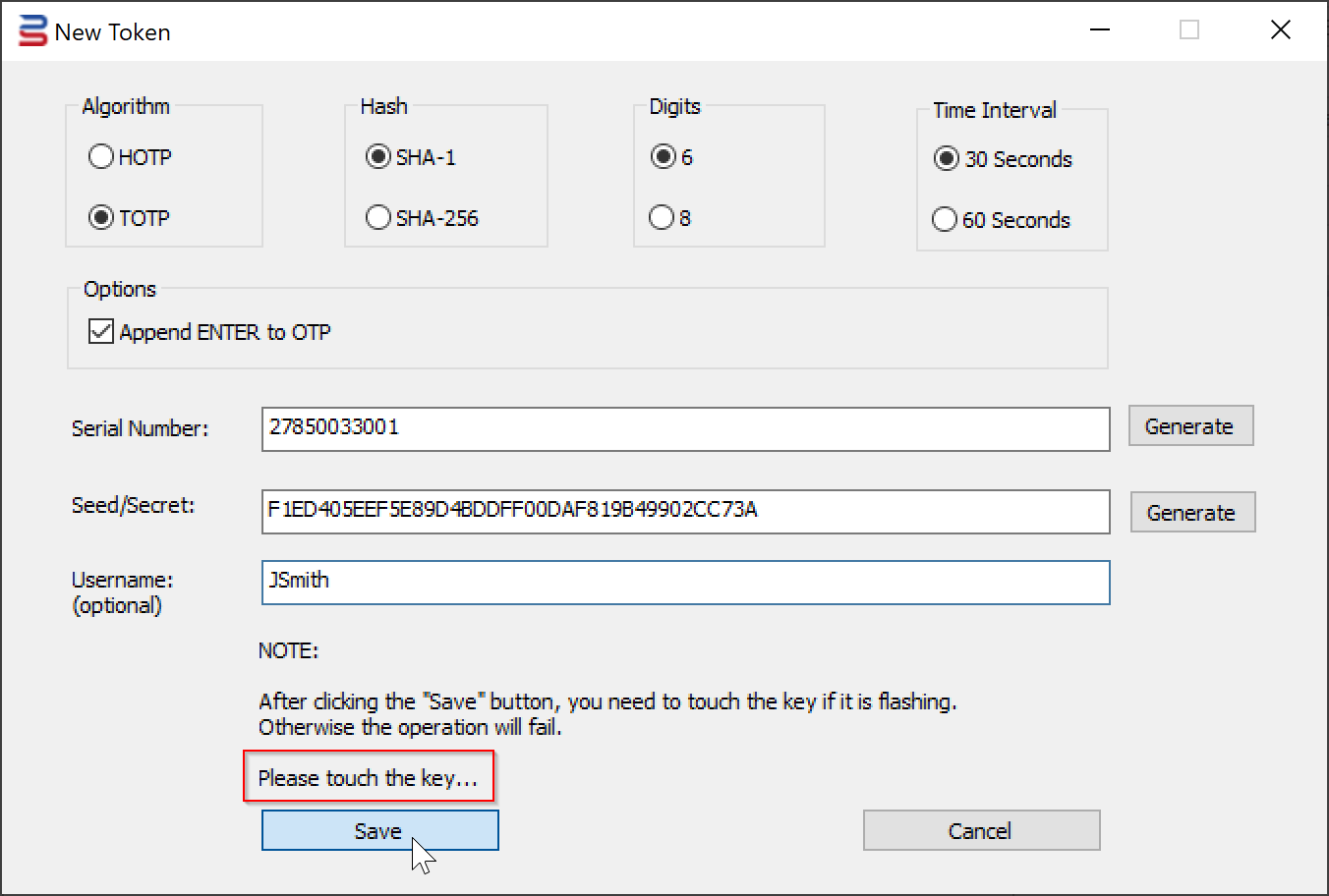 11. Finally, press the "Save" button, and touch the key immediately to save the token into the USB key.