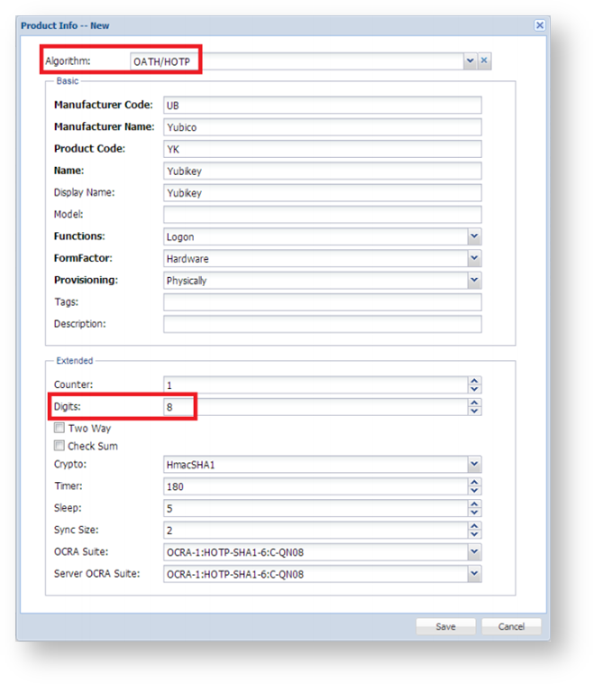 - Complete the production creation page as below (assuming that you will configure your Yubikey to support OATH/HOTP with 8-digit display.