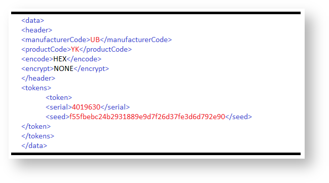 | <data> <header> <manufacturerCode>UB</manufacturerCode> <productCode>YK</productCode> <encode>HEX</encode> <encrypt>NONE</encrypt> </header> <tokens> <token> <serial>4019630</serial> <seed>f55fbebc24b2931889e9d7f26d37fe3d6d792e90 </seed> </token> </tokens> </data> |
