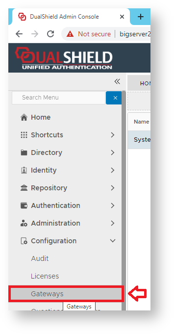 In the DualShield Admin Console, Navigate to "Configuration | Gateways", then click on the button "CREATE";