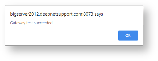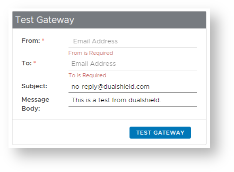 - After entering the test gateway fields (and after ensuring that the from address is a valid email address), you can test the functionality of the gateway by clicking on the "TEST GATEWAY" button (which will produce a message indicating if the email was sent correctly);