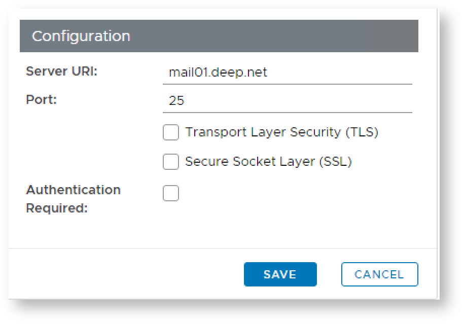 Section Column width 70% Expand title Server URL Panel borderColor grey bgColor #F8F8F8 borderStyle dashed Enter the address of your SMTP Server (in this example our mail server is at “mail.deepnetsecurity.com”),