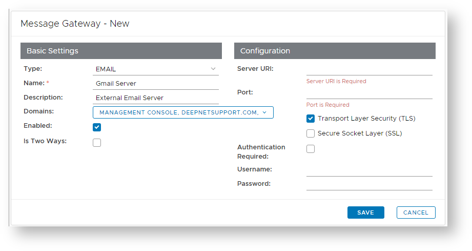 At the prompt "Type:", select "EMAIL", enter a suitable name and description for the email gateway, and select what domains will be able to use the message gateway;