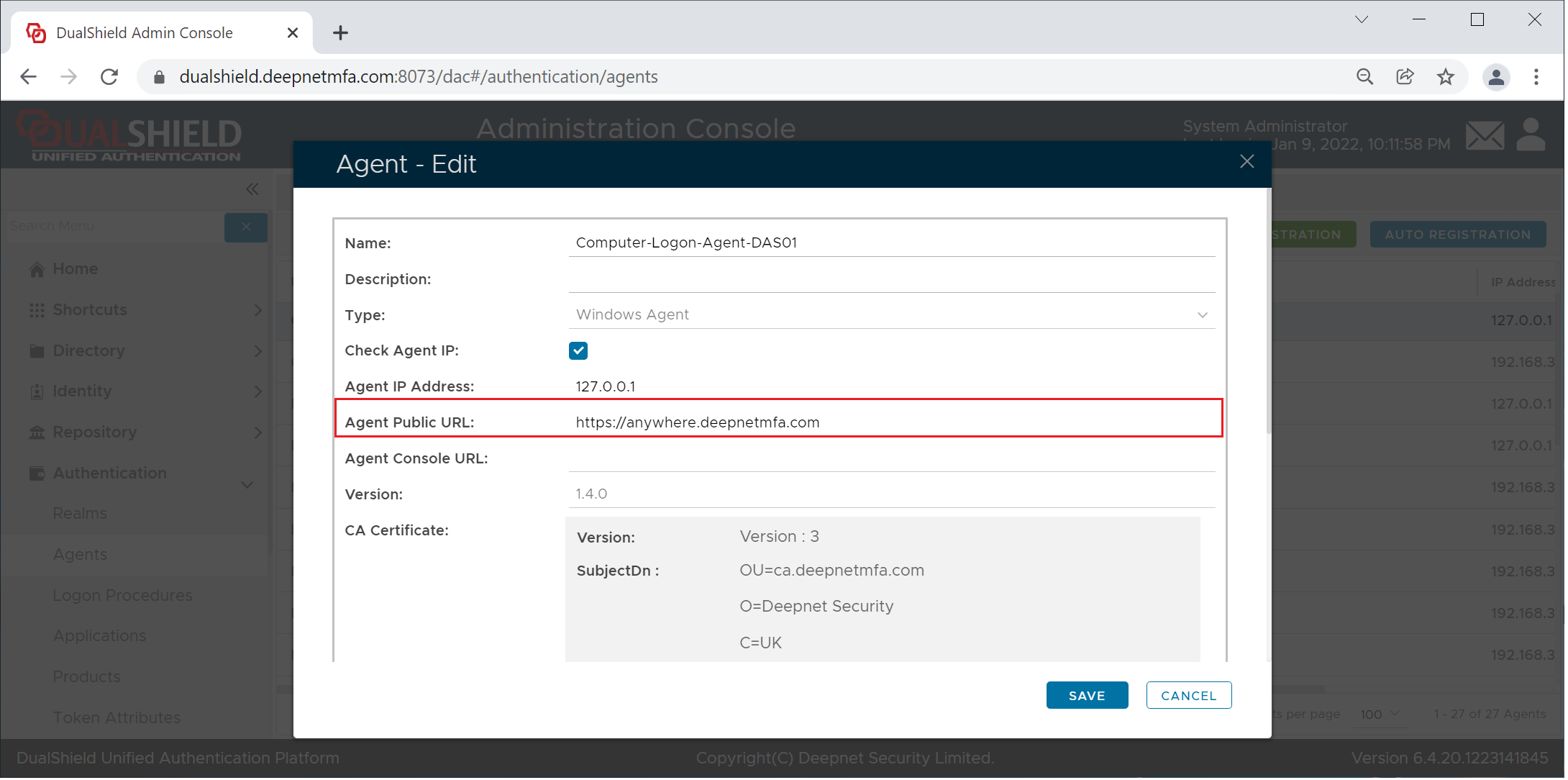 In the DualShield Admin Console, find the computer logon agent in Authentication | Agents