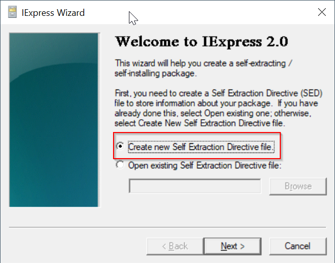 Select the option "Create new Self Extraction Directive file"