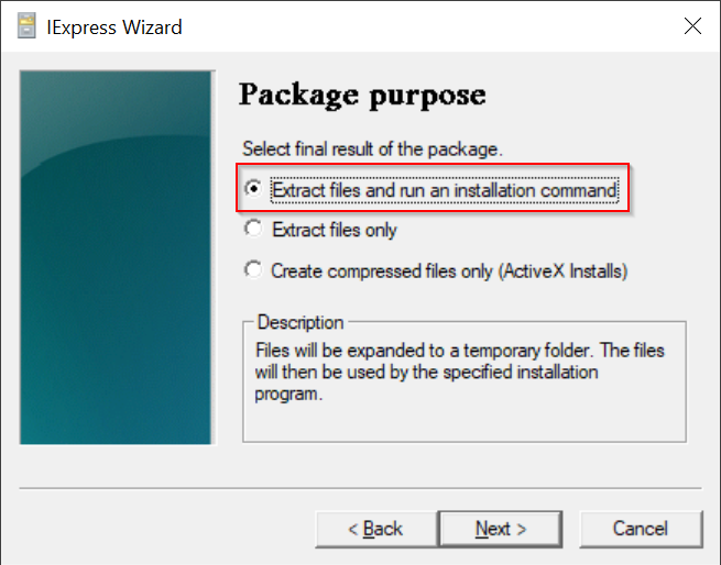 Select the option "Extract files and run an installation command"