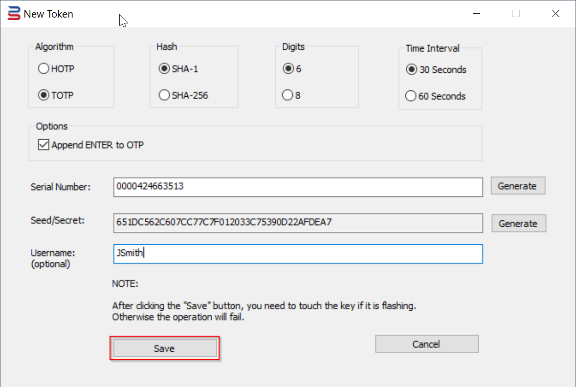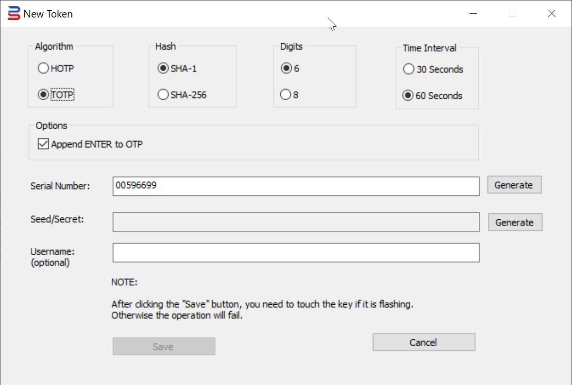 To create a TOTP token in a SafeKey/Classic device, follow the steps below (these instructions only apply to the NFC variants of the SafeKey/classic devices - the USB-A variant only supports the HOTP algorithm).