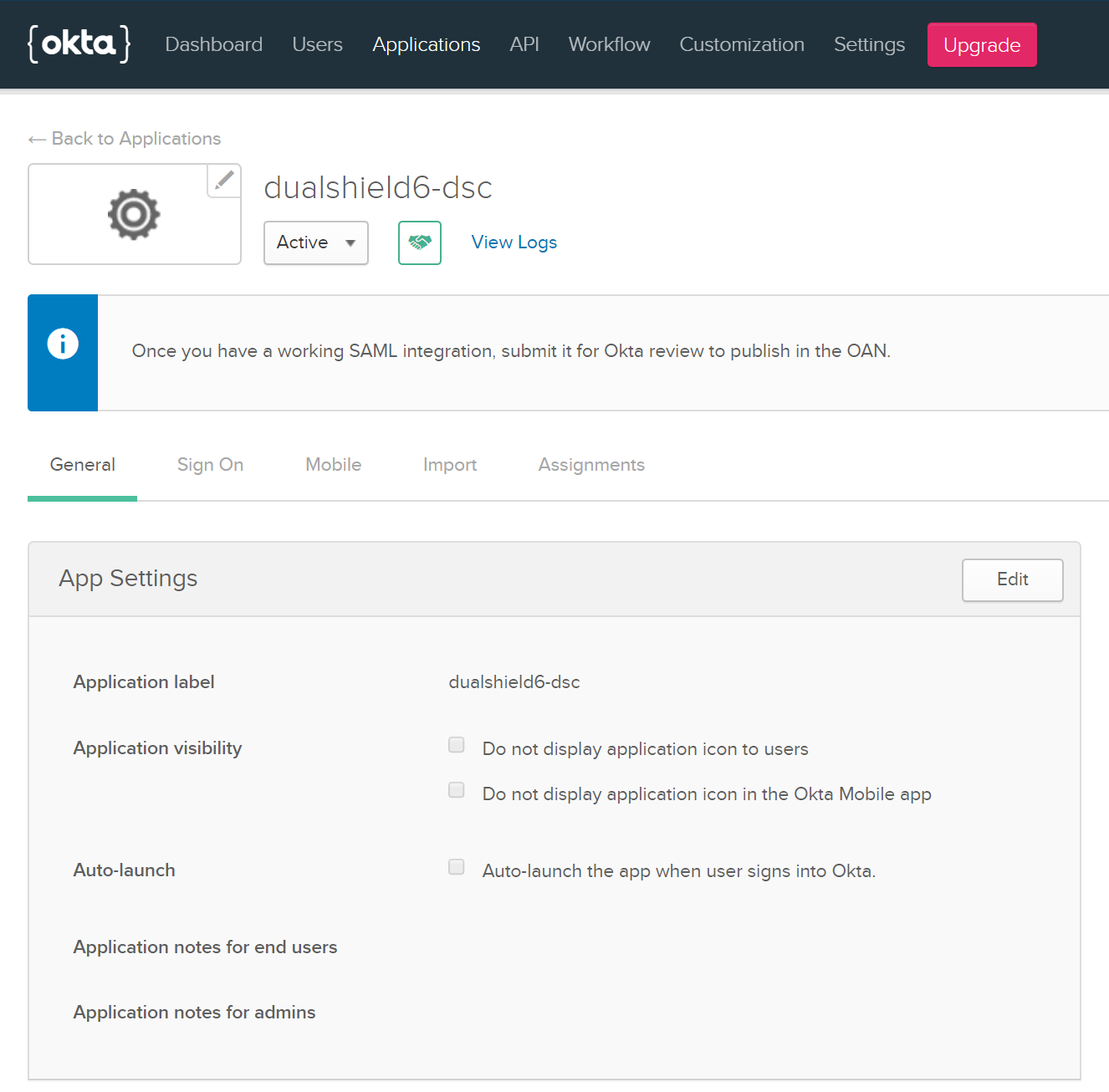 In OKTA, create a SAML application, e.g. dualShield6-dsc