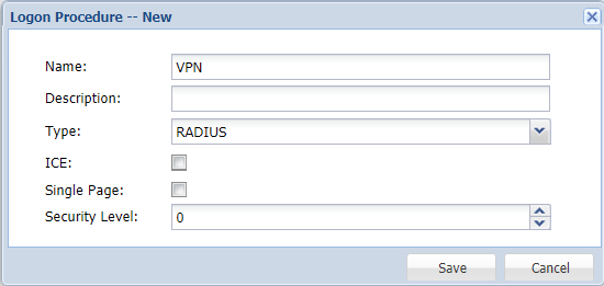 Enter the "Name", "Description" and select "RADIUS" from the "Type" list. Click "Save" to create the logon procedure.