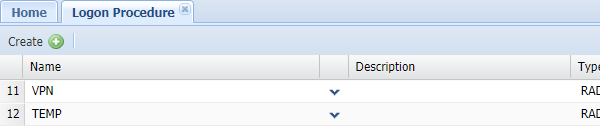 To create a Radius Logon Procedure, select “Authentication | Logon Procedure” and click the “Create” button on the toolbar: