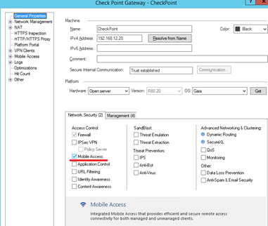 In the General Properties, Network Security tab, enable “Mobile Access”.