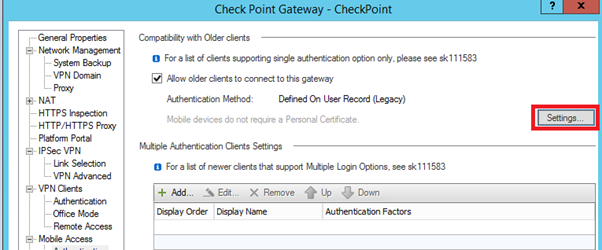 Navigate to General Properties | Mobile Access | Authentication. Click “Settings”.