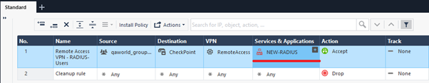 Select “Security policies”, select “NEW-RADIUS” in “Services & Applications” column, and then click “Install Policy”.
