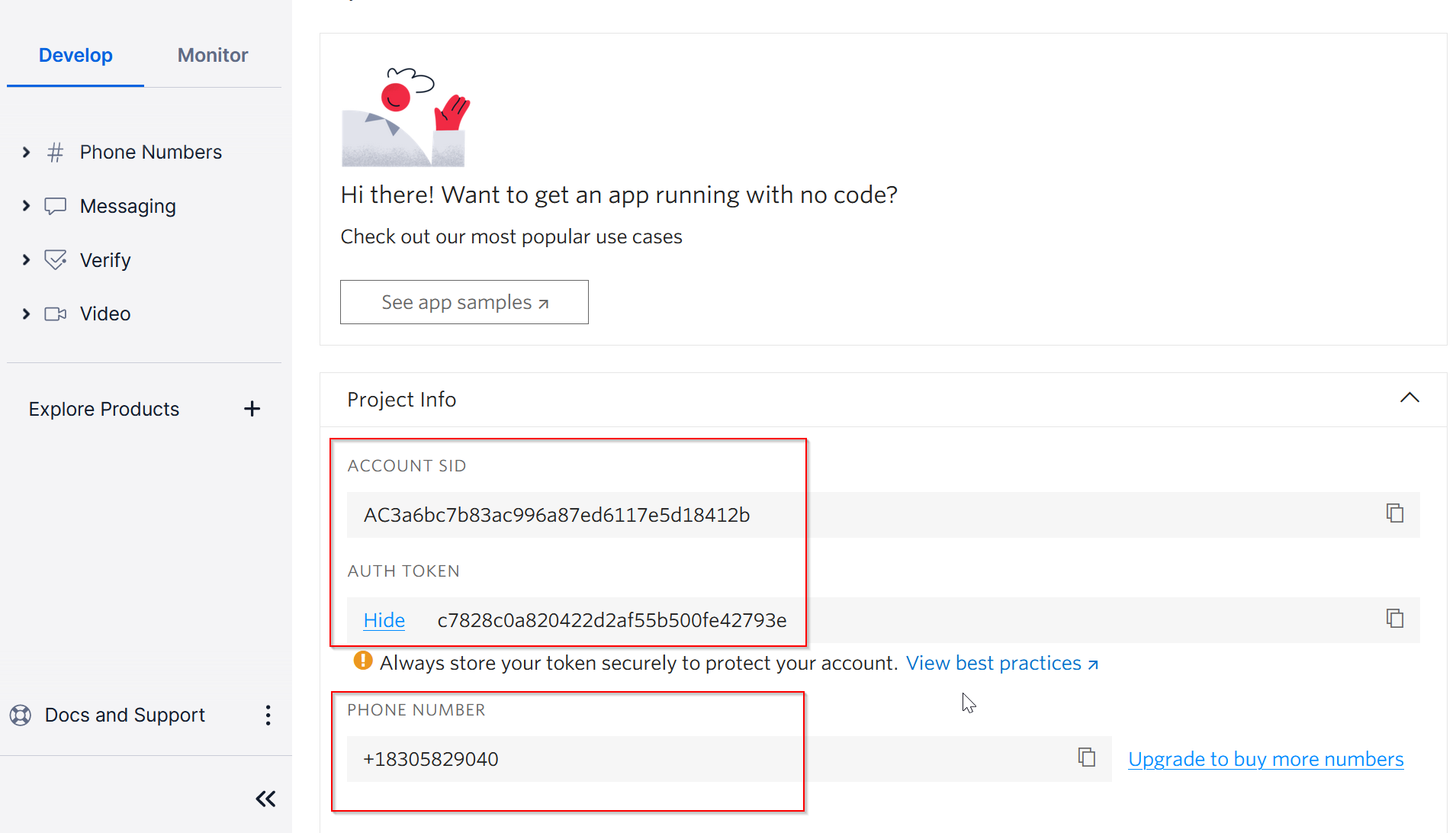 Copy out the ACCOUNT SID, AUTH TOKEN and PHONE NUMBER