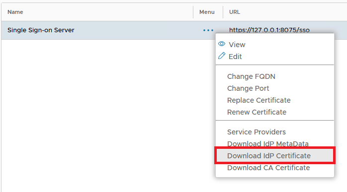 Select the context "..." menu of 'Single Sign-on Server' then select, "Download IdP Certificate". A CRT file will be saved to the local machine: