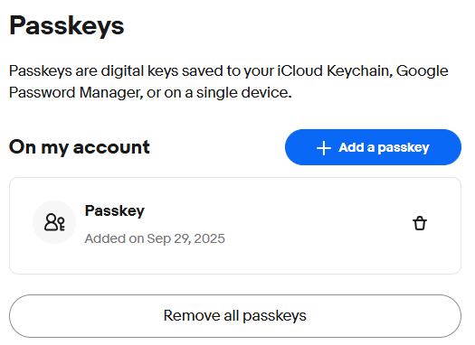 Click "OK", and the FIIDO2 key will be registered with eBay, and you will be shown confirmation that the passkey has been added;
