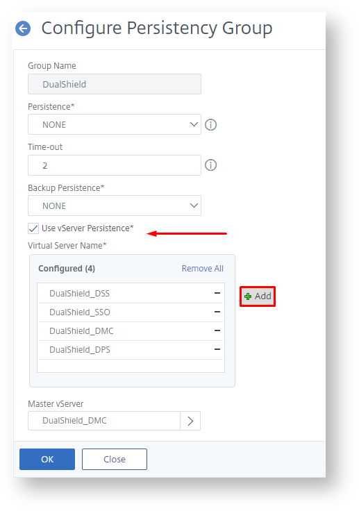 Enter "Name",  enable "Use vServer Persistence" and add all the virtual servers we have created.