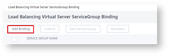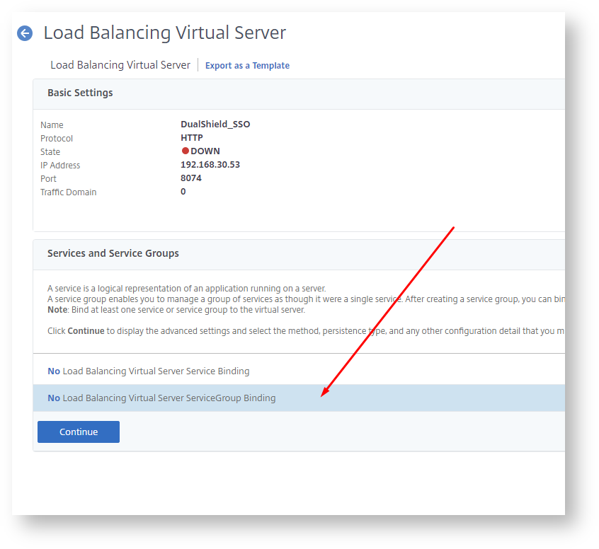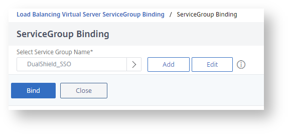 Now, we need to bind the newly created virtual server to a service group. In this example, we'll bind this virtual server to the DSS service group: